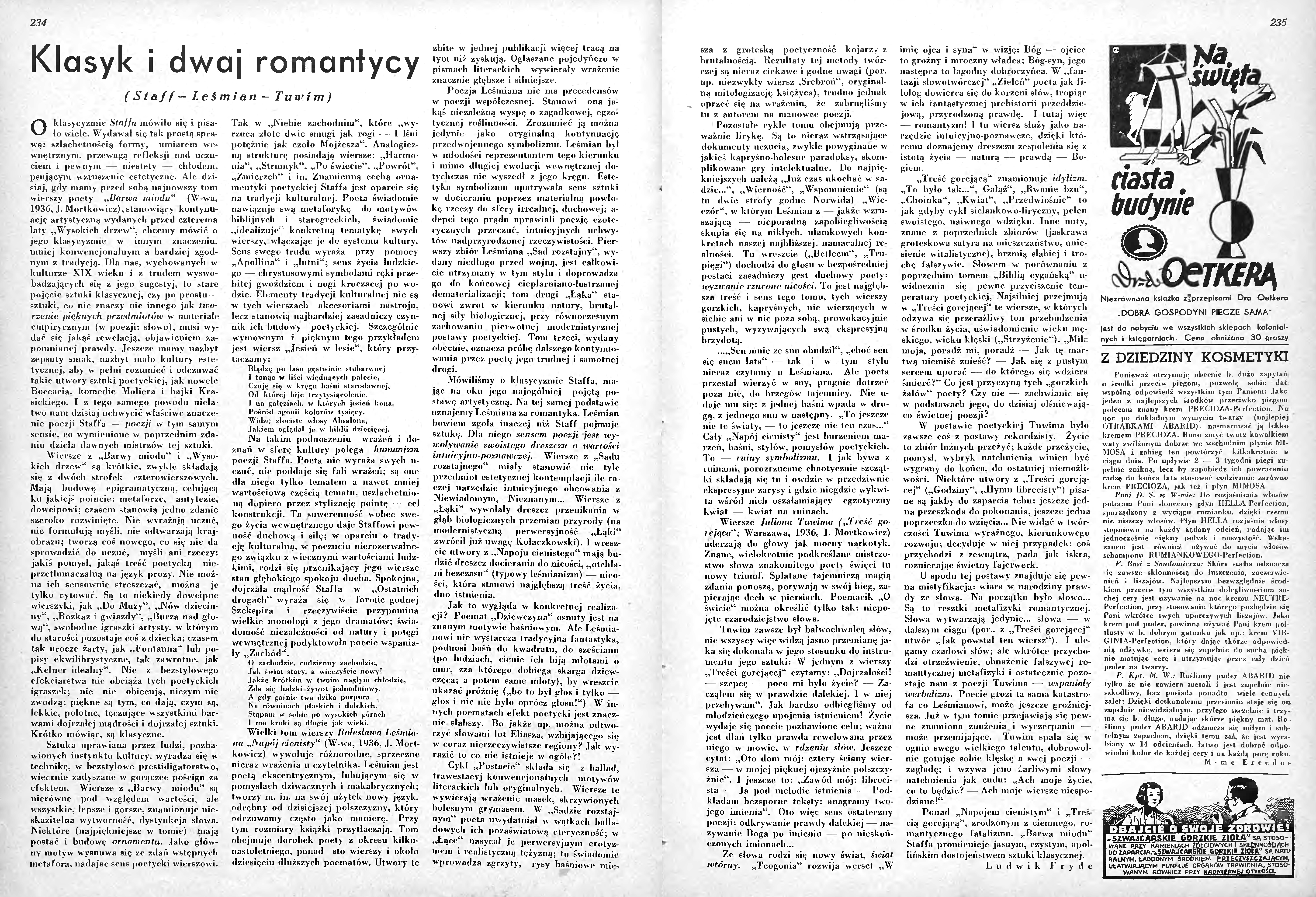 - Fryde, Ludwik: Klasyk i dwaj romantycy (Staff – Leśmian – Tuwim). W: Tygodnik illustrowany. 1937, nr 12 s. 234-235 100620 IV Lect. Pełny numer czasopisma znajduje się w zbiorach Biblioteki Cyfrowej Uniwersytetu Łódzkiego.